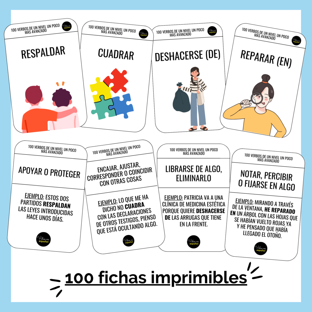 - 100 fichas (para imprimir) -> gracias a ellas podrás adquirir el vocabulario nuevo de manera eficaz y repasarlo regularmente :) Cada ficha contiene un verbo, su definición y un ejemplo de su uso.